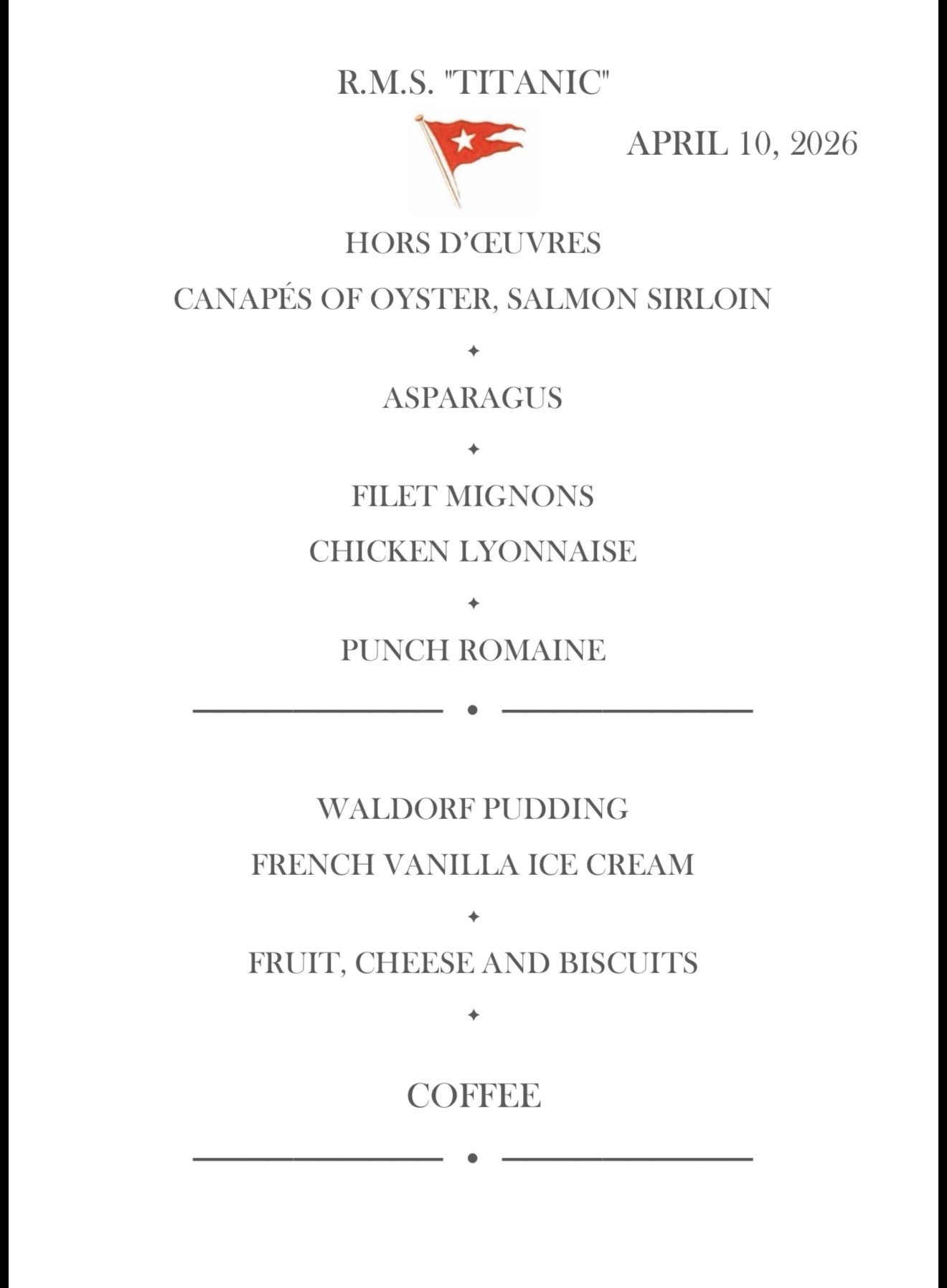 On the night of 10th April 1912, the Titanic set sail on her maiden voyage. The following evening, first‑class passengers were served what would become their final meal.